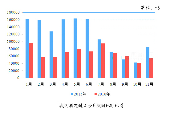 據中國海關總署統計,2016年11月,我國進口棉花5.50萬噸,環比增加1.36萬噸,增幅32.99%;同比減少2.95萬噸,減幅34.92%;2016年1-11月,我國累計進口棉花75.12萬噸,同比減少53.47萬噸,減幅41.58%。2016/2017年度,我國累計進口棉花15.70萬噸,同比減少2.06萬噸,減幅11.59%。